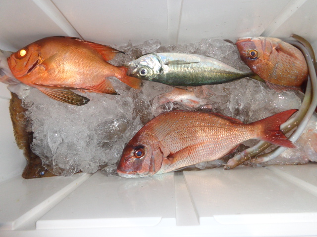 マダイ 3.0,3.8kg 2尾、小マダイ 8尾、ヒラメ 3.5kg 1尾、