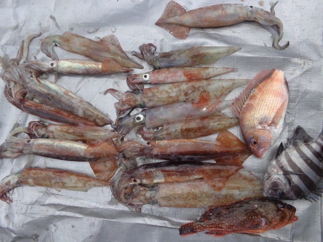 ヤリイカ胴長20~35cm)29尾、スルメイカ 14尾、サバ・マダイ・イシダイ・カサゴ・各1尾、