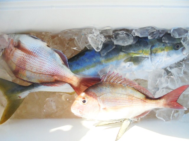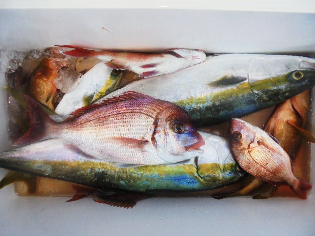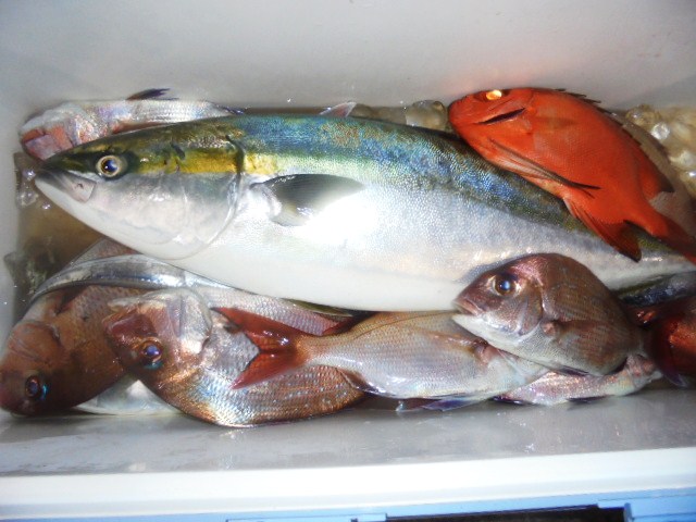 アオリイカ 7ハイ、イナダ 1尾、マダイ 4尾、